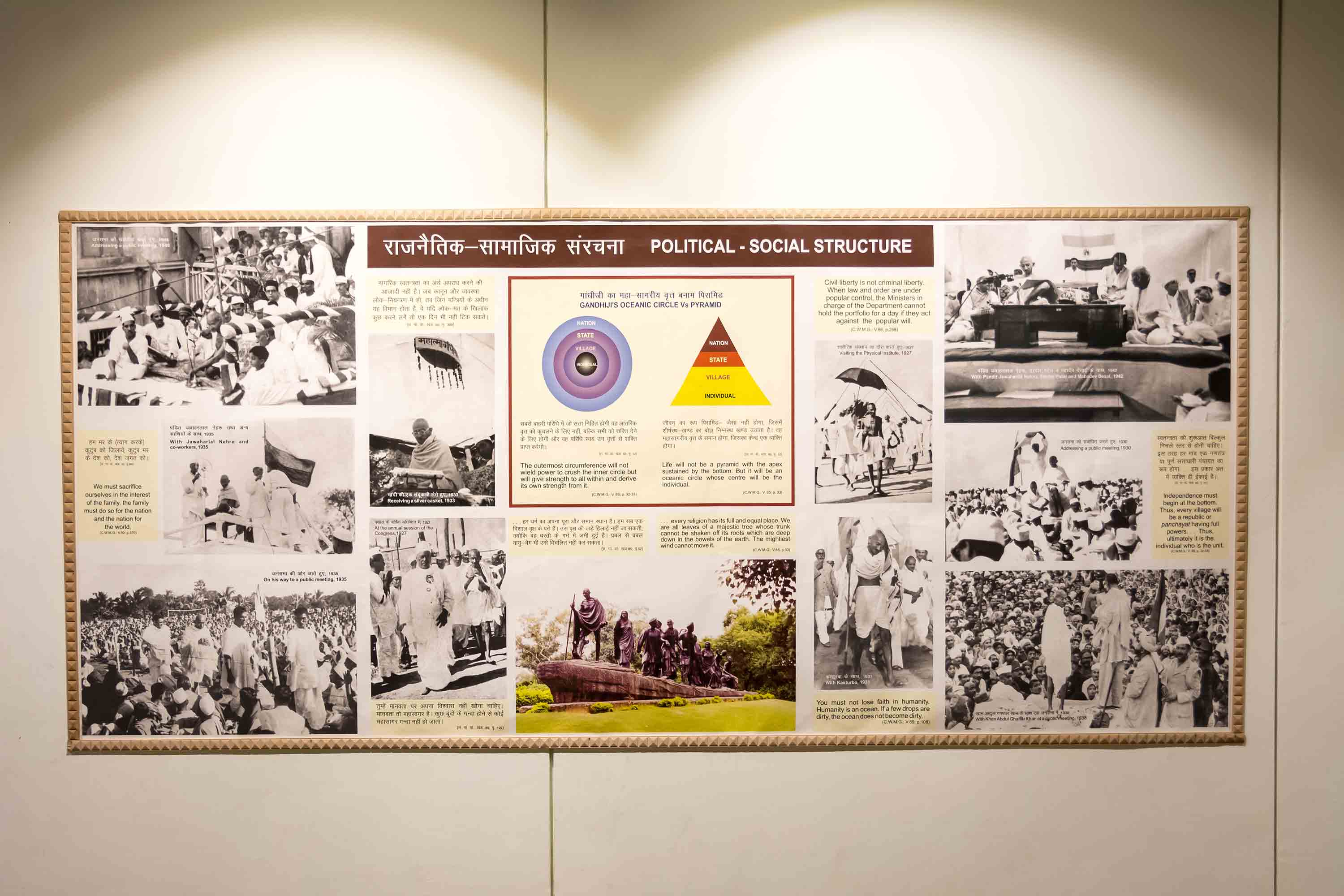 The spinning wheel gallery displays 23 models of spinning wheels (charkhas) from the traditional to the portable versions, like peti charkha and the mechanized versions, including ambar charkha, two models of looms, samples of various components and ancillaries related to hand spinning, samples of yarn hand-spun by Gandhiji and other leaders. The photography gallery shows selected write-ups by Gandhiji, and photographs of Gandhiji and other leaders of the freedom struggle working on the spinning wheel. Nearly 285 photographs of Mahatma Gandhi in chronological order, divided into ten phases, with write-ups for each phase –from childhood upto his final arrival in Delhi in 1947 - have been displayed. The commemorative gallery displays Gandhi's personal belongings. Other galleries are the martyrdom gallery housing the blood-stained dhoti (worn during his assassination), the art gallery showing artworks inspired by Gandhi, and finally the ashram gallery that displays replicas of Gandhi's cottages from South Africa, Satyagraha Ashram (Sabarmati), and Sevagram Ashram (near Wardha).