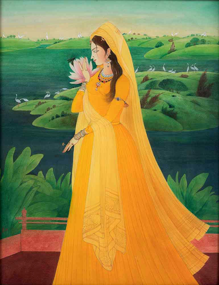 Radha Madhava is a small-format reproduction of a similar painting housed in the Maharaja Fateh Singh Museum, Baroda, and was produced in order to create lithographs at the printing press that the artist had established.