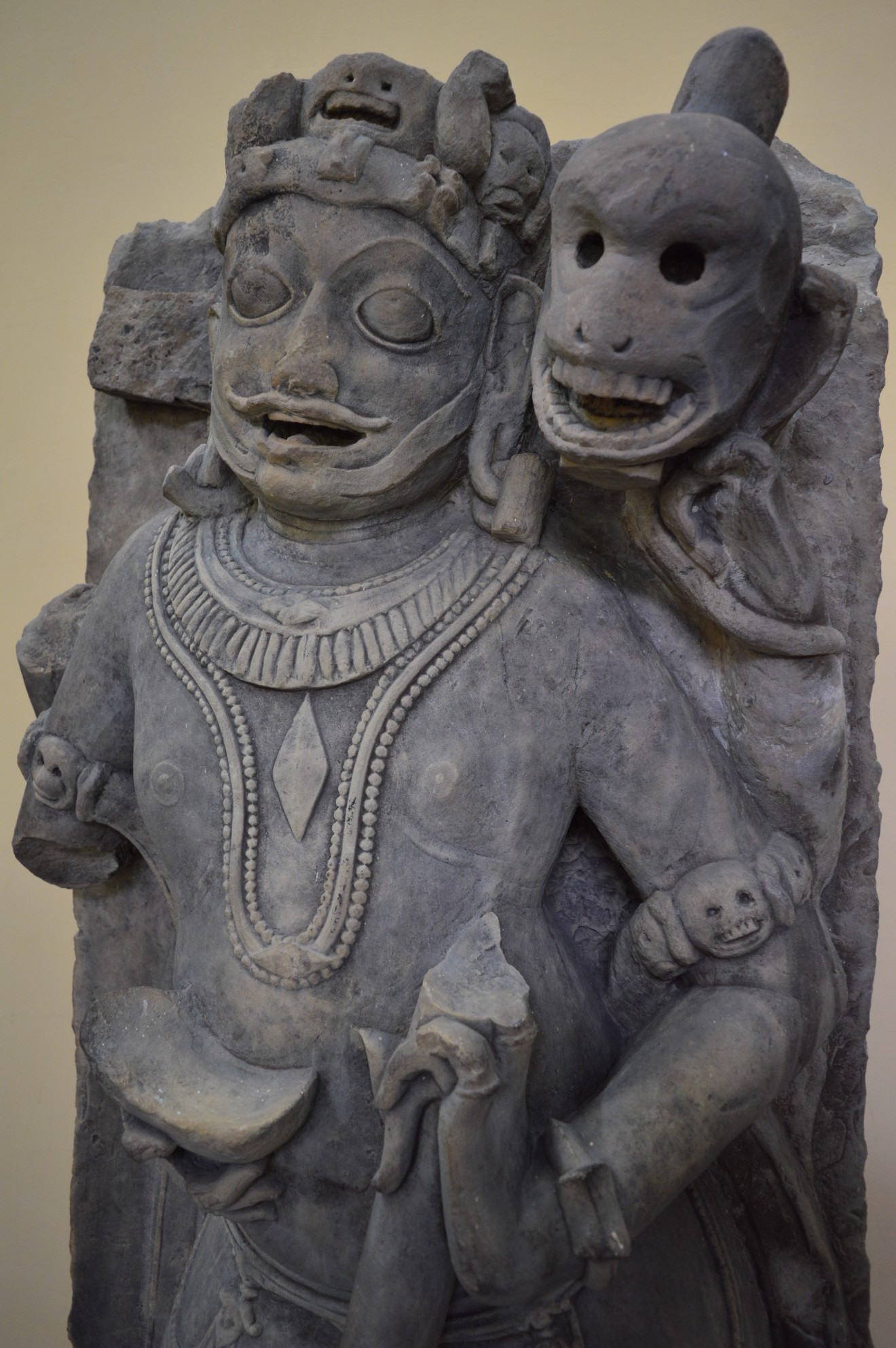 The figure of Bhairava is depicted in a standing posture. The lower right hand holds a bowl, while the upper right hand is broken. The lower and upper left hands hold a khatvanga and a snake-like object respectively. The face sports a beard and moustache, and the mouth is open. The human skulls on the khatvanga and the jata bare their teeth in demonic laughter.