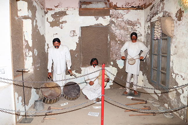 Wax statues playing instruments including nagara, tamate and hanging nagara, typically found in an Indian village