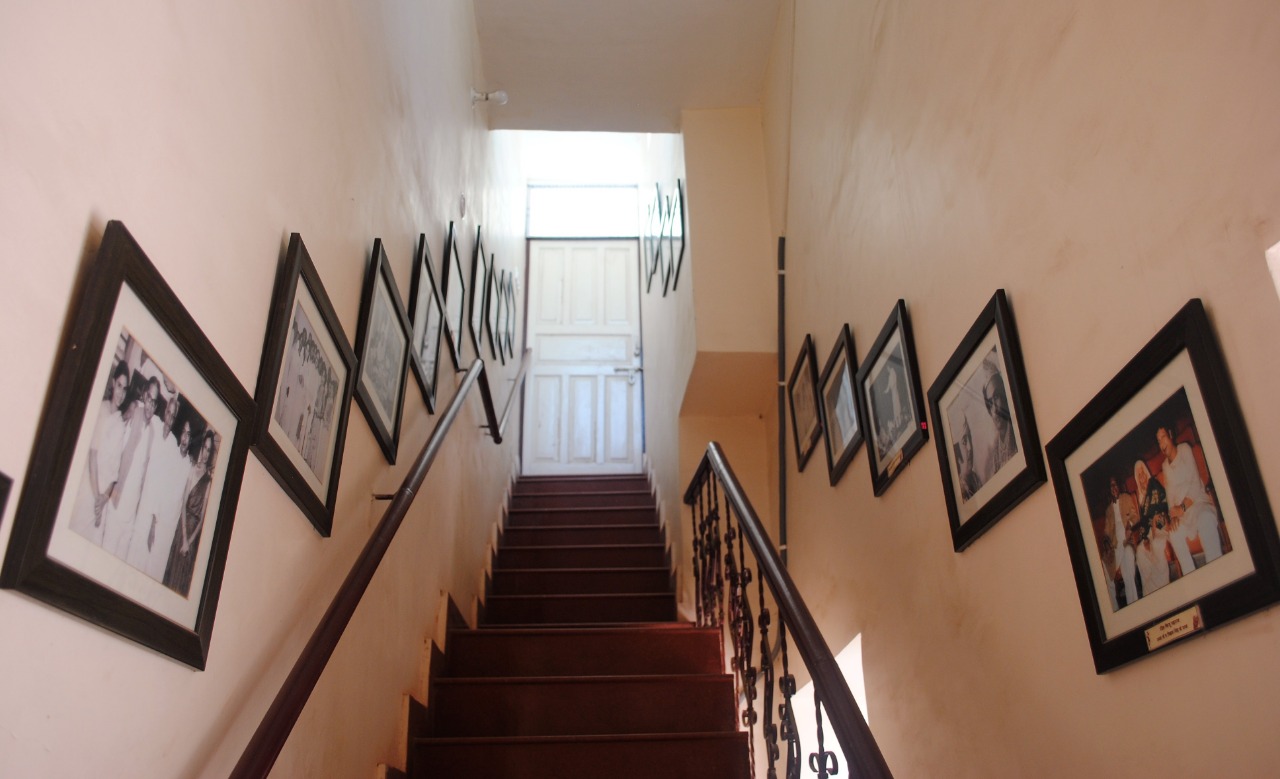 A courtyard with a three-dimensional mural of dancers and a well opens into the main museum. This museum is the ancestral home of Birju Maharaj, which was given to his ancestors by Wajid Ali Shah, a great patron of arts and culture in the city of Nawabs, Lucknow. The main hall has a series of framed photographs on display of Birju Maharaj's performances with maestros like Girija Devi. There is also an old camera on display that belonged to Birju Maharaj along with his ghungurus. Busts of Shambhu Maharaj, Lachchhu Maharaj and Achchhan Maharaj are also on display, along with a poshak that was worn by Maharaj Kalka Bindadin, considered the architect of the present form of the Lucknow Gharana, in one of his performances. A kiosk also offers information about the family tree of Birju Maharaj.