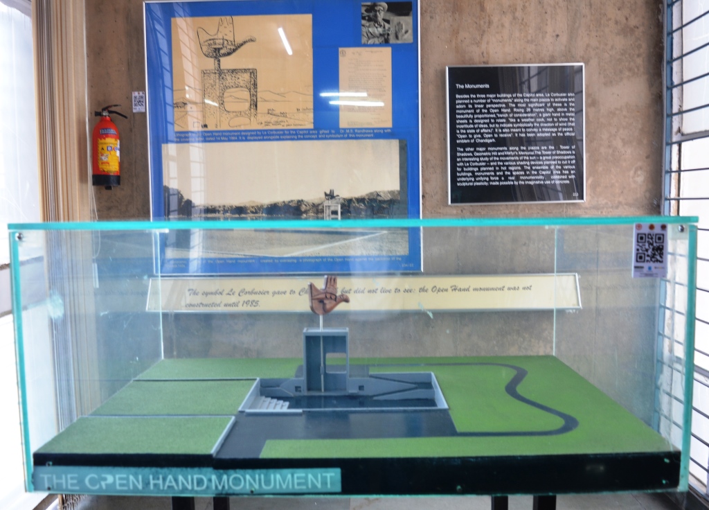 The exhibits on the third level are based on the theme 'Chandigarh Today and Tomorrow'. The model of the hyperbolic-paraboloid dome of the Chandigarh Assembly is displayed along with models of the secretariat and tastefully designed utilitarian furniture by Pierre Jeanerette. A long graph-like-panel is also on display, carrying various details such as physical geography, human geography, ethics, etc. The Open Hand monument, symbolic of peace and unity, is also replicated in a model and showcased in the gallery.